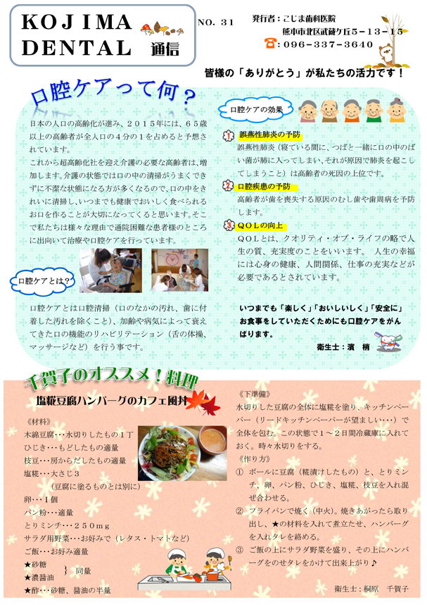 KOJIDEN通信は、こじま歯科医院スタッフが製作しています。歯科に役立つ内容だったり、料理レシピだったり、私たちスタッフが気になる情報も掲載しています。ぜひご覧ください。