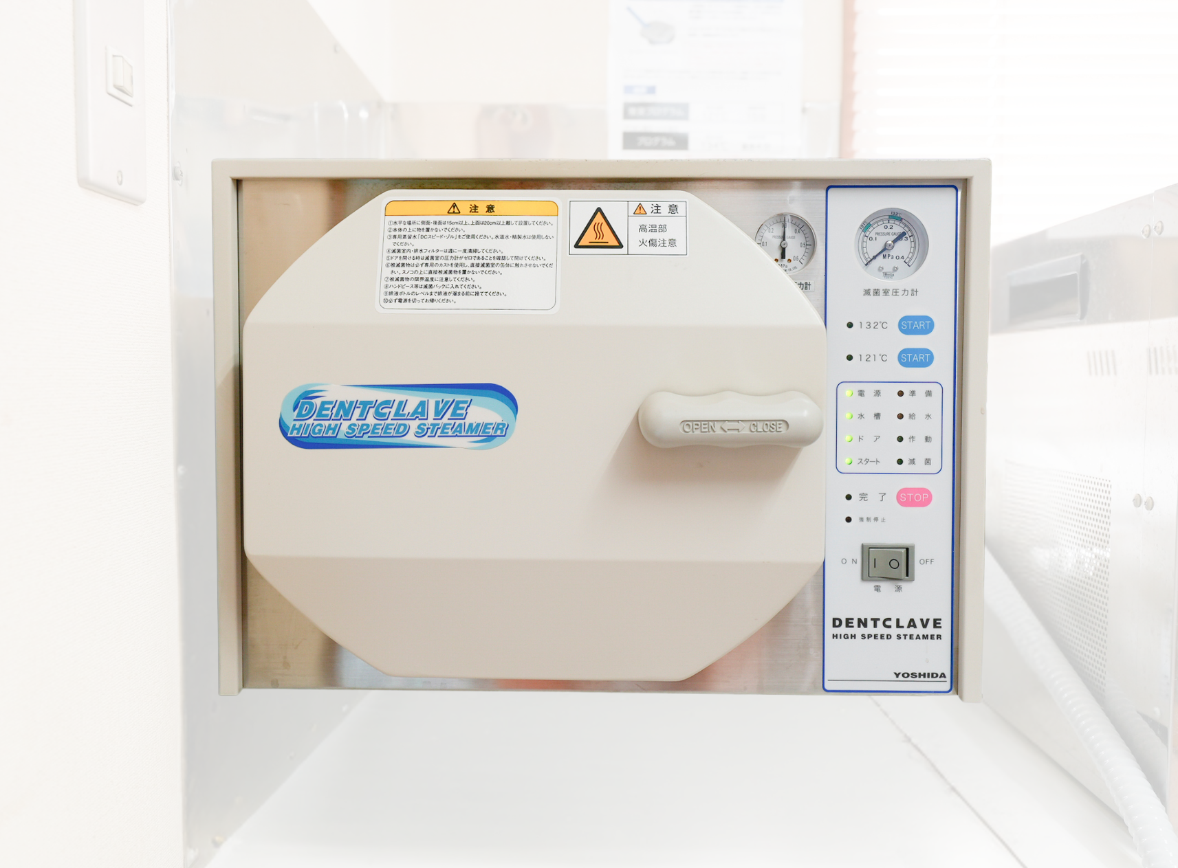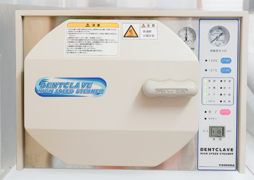 治療で用いる様々な器具の滅菌処理に用いる高圧蒸気滅菌器です。器具を洗浄・消毒してから、1つずつ個別包装にしてオートクレーブ滅菌器による高圧滅菌処理を行います。圧力による高温状態の庫内に蒸気を充満させ、細菌やウィルスを滅菌することが可能です。