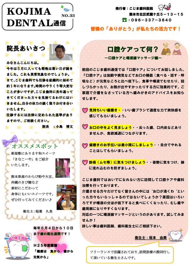 KOJIDEN通信は、こじま歯科医院スタッフが製作しています。歯科に役立つ内容だったり、料理レシピだったり、私たちスタッフが気になる情報も掲載しています。ぜひご覧ください。
