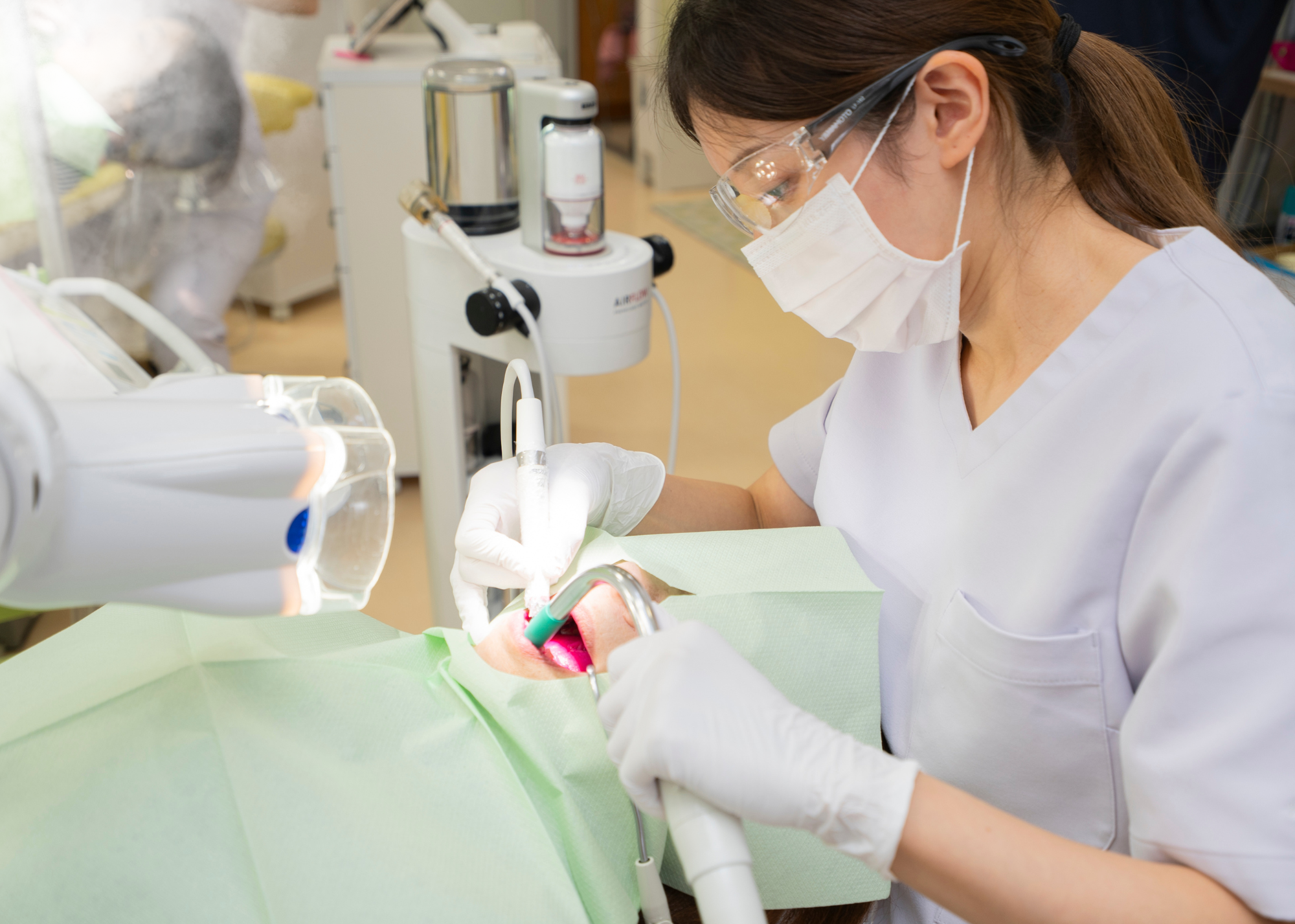 こじま歯科医院のメインテナンスでは、全ての患者様に歯垢の染め出しを必ず実施しています。染め出しにより、患者様ご自身が日頃の磨き残しを把握できるとともに、歯科衛生士も磨き残しや隠れた歯石を可視化して徹底的に除去します。特に当院はエアフローという機械を導入しており、これによって歯や歯ぐきに優しく、よりソフトに、効率もよく汚れを取り除くことができます。当院では保険内のメインテナンスの一環としてご提供しております。