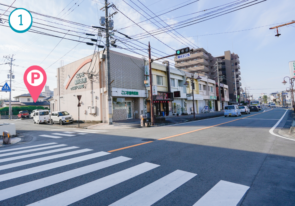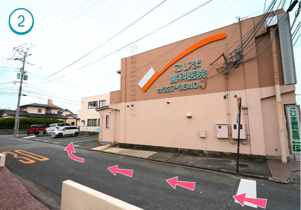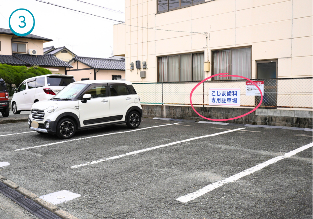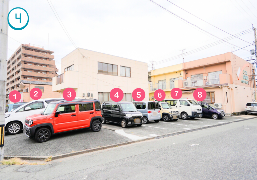 車でお越しの患者様へ。当院は建物の裏手に無料の駐車場がございます。安心してお越しください。わかりにくい・ご質問などあればお電話ください。駐車台数は約8台程あり、ゆったり駐車していだだけます。