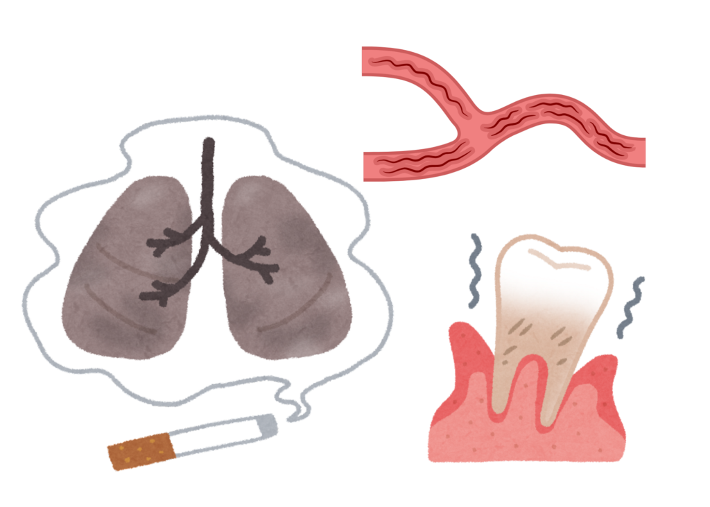 タバコに含まれるニコチンは血管を収縮させ、歯ぐきの血流を悪くします。その結果、酸素や栄養が十分に行き渡らなくなり、細菌と戦う「免疫力」が低下してしまいます。本来なら身体が守ってくれるはずのバイキンに対して、非常に無防備な状態になってしまうのです。